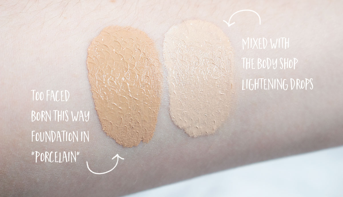 As you can see above, my Too Faced Born This Way Foundation in “Porcelain” (which isn’t porcelain at all really) is far too dark for my skin. Look at how much lighter it is mixed with a couple of lightening drops, it’s fab! It’s also completely took away the orangeness and made it into such a neutral shade. The drops don’t alter the formula of your product either, all they do is lift the shade of it. I honestly couldn’t recommend these drops any more, I’m so happy with the results!