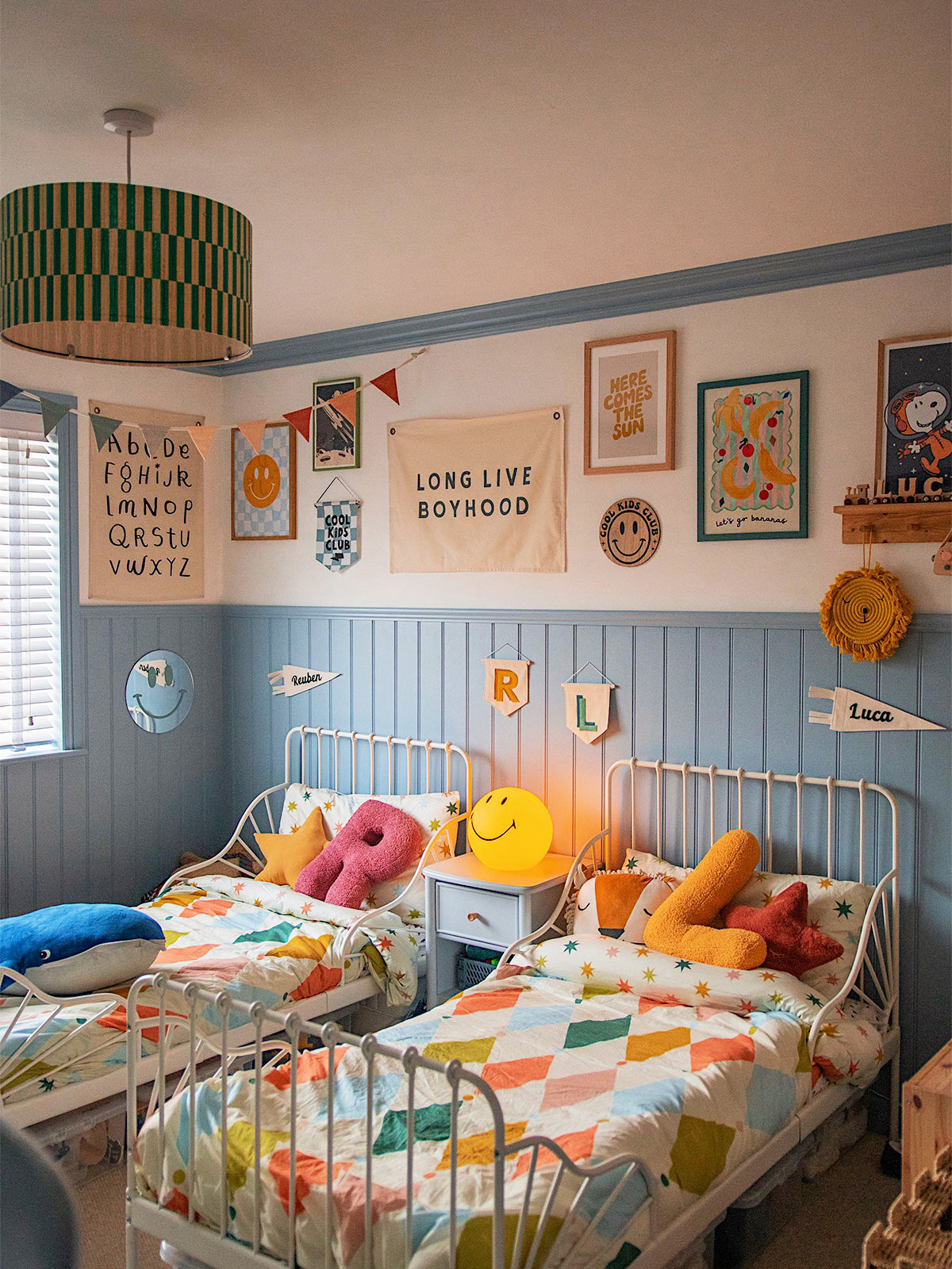 Once the painting and DIY was all done with, I started on my favourite bit – the decorating! I added lots of fun, colourful prints to give the room lots of character, as well as some bunting, Luca’s little rattan balloon, and the peg shelf from his old bedroom. I bought both boys a personalised flag with their name on for above their beds, and put up an initial wall hanging above their bedside table. One of my favourite pieces is this smiley lamp which is a dimmable lamp perfect for at night if they don’t want to sleep in the dark. Their new bedside table is from Dunelm, and their gorgeous colourful bedding is from John Lewis.